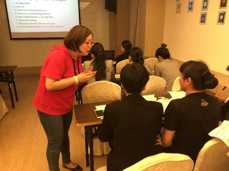 培训开始后,针对乾元酒店参训员工英语基础薄弱、培训时间有限等现实情况,我校先后派出三位经验丰富、教学手段新颖、亲和开朗善于鼓励学员的优秀教师参与项目。放下原有教材,根据学员的英语基础编写专门的教案、常用词汇表、练习题,就大堂待客、餐厅点单、客房服务等多个方面,为各部门员工提供了高质量的教学与模拟场景演练。学员们在充实、愉快的气氛下,掌握了实用的表达。