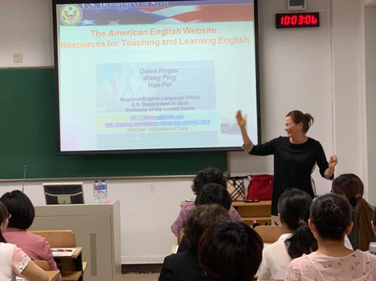 6月10日上午,北京语言大学培训学院特邀RELO Beijing办公室学者Dawn Rogier女士,为我校青年英语教师做了一场关于如何查找及使用英语教学资源的讲座。