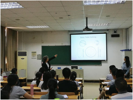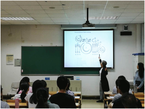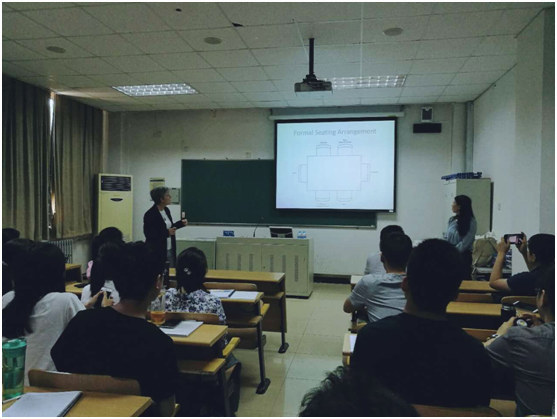 讲座围绕见面问好、着装礼仪、做客礼仪、餐桌礼仪、餐具使用规范、小费文化等内容展开,通过图片展示、举例说明的方式生动形象的展示了美国社会生活和商务场合方方面面的礼仪文化。此外,主讲人Janice女士也将美国礼仪与欧洲各国及世界其他国家和地区进行了对比,阐述了美国礼仪的独特性和世界性。
