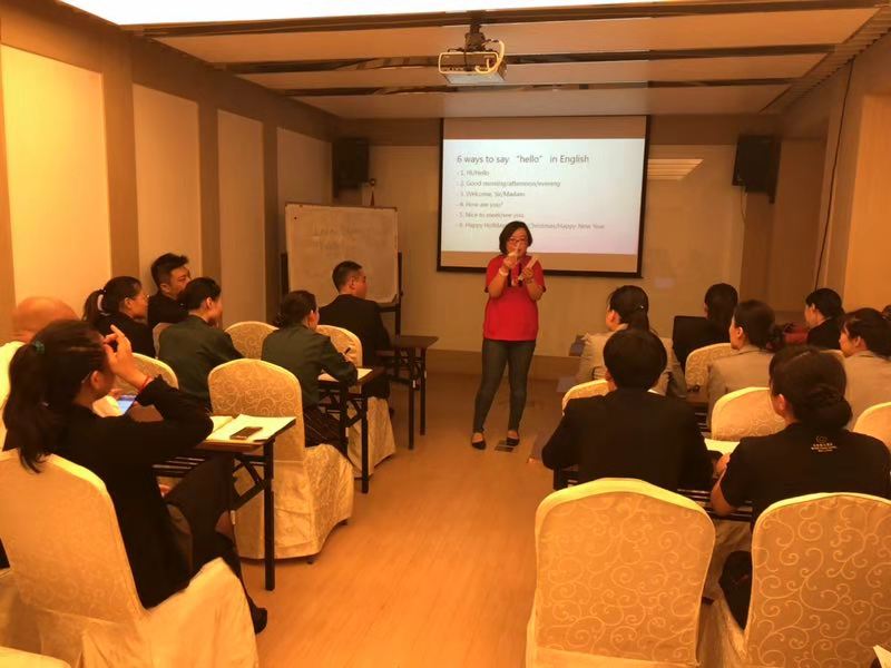 培训开始后,针对乾元酒店参训员工英语基础薄弱、培训时间有限等现实情况,我校先后派出三位经验丰富、教学手段新颖、亲和开朗善于鼓励学员的优秀教师参与项目。放下原有教材,根据学员的英语基础编写专门的教案、常用词汇表、练习题,就大堂待客、餐厅点单、客房服务等多个方面,为各部门员工提供了高质量的教学与模拟场景演练。学员们在充实、愉快的气氛下,掌握了实用的表达。