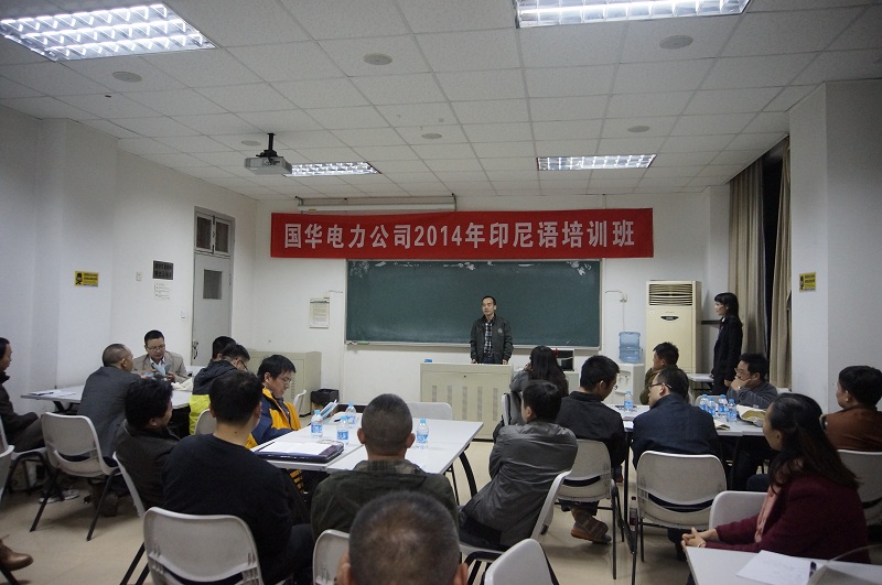 2014年,中国神华能源股份有限公司国华电力分公司(简称国华电力)经过对多家培训机构的考察评比,最终选定我部承接印尼语培训项目。该项目的三十名参训人员由总公司从全国各分公司筛选而出,学生年龄层次跨度较大,语言背景参差不齐。本项目旨在通过三个月的集中培训为国华电力的印尼分公司储备懂语言的技术人才。外语部精心挑选搭配了7名优秀师资(4名主课老师,3名辅导老师),为其开设四门课:综合印尼语、印尼语操练、印尼语口语、印尼文化课,另外提供组织包括晨读和晚自习的附加服务。